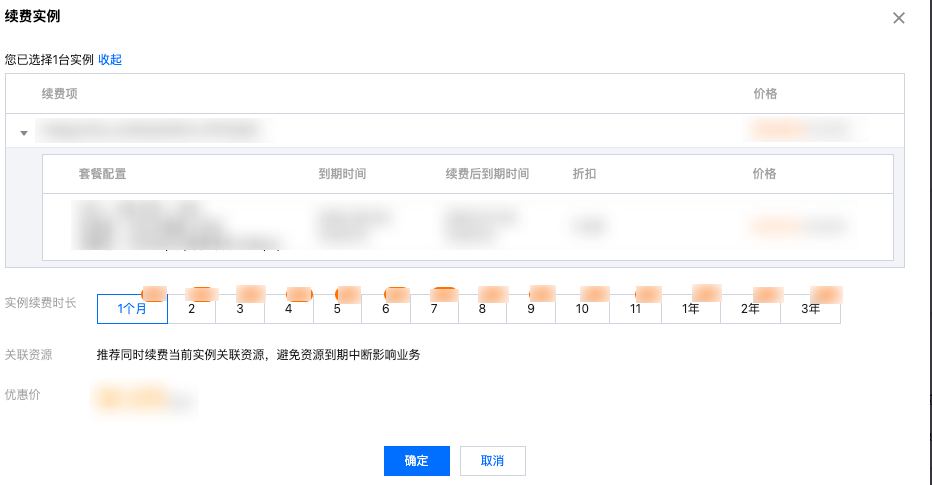 3. 在弹出的“续费实例”窗口中选择续费时长,单击确定即可完成续费。