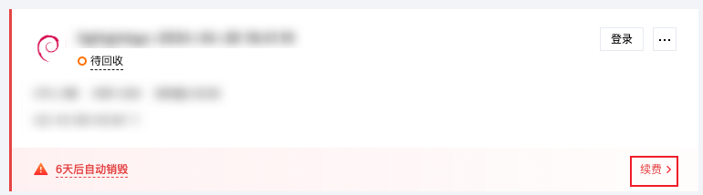 2. 在服务器列表中的实例卡片上,选择右下角续费。如下图所示: