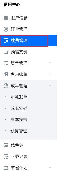 2. 单击右上角的费用进入费用中心,点击左侧导航栏中的续费管理页签。