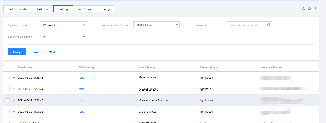 轻量应用服务器支持 操作审计,您可参考以下步骤,通过操作审计控制台获取操作记录。更多操作审计操作记录相关信息,请参见 查看操作记录事件详情。 1. 登录操作审计控制台,选择左侧导航栏中的 操作记录。 2. “资源事件名称”选择 “LIGHTHOUSE”,单击查询即可查看日志记录。如下图所示: