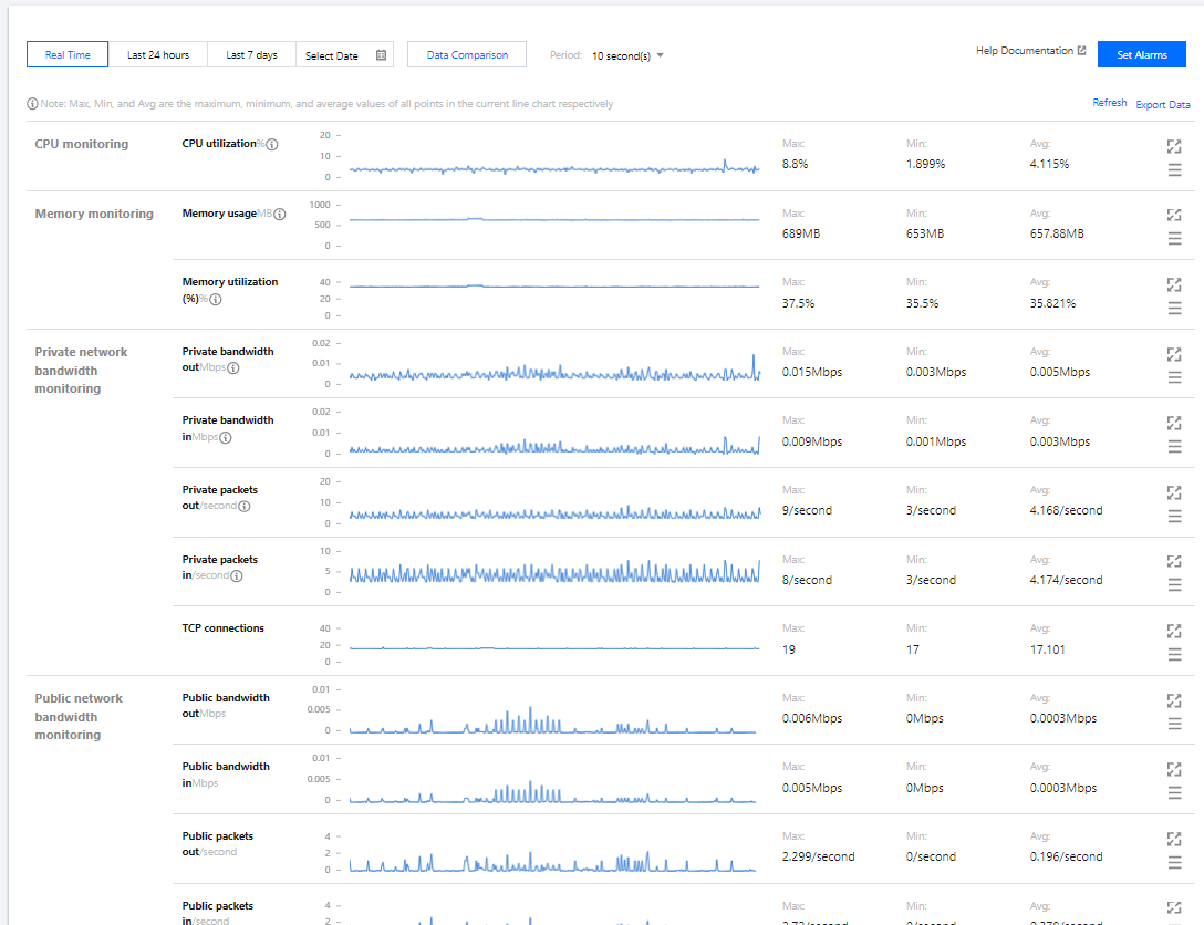 3. 选择监控页签,即可进入监控信息页面,查看轻量应用服务器实例的 CPU、内存、内网带宽、外网带宽以及磁盘(系统盘及数据盘)使用情况的监控信息。如下图所示: