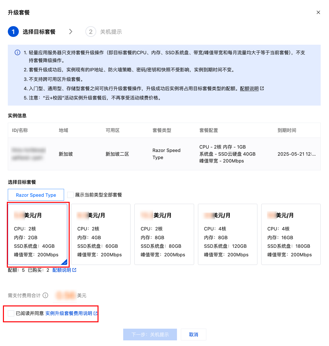 4. 在弹出的升级套餐窗口中,选择目标套餐。阅读并勾选实例升级套餐费用说明,并单击下一步:关机提示。如下图所示: