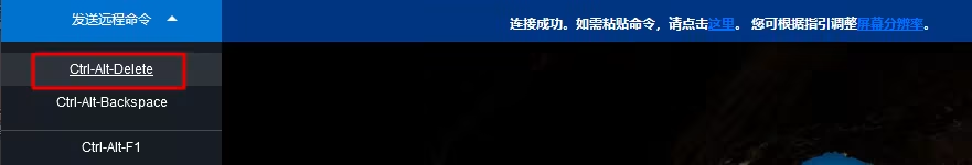 3. 在弹出的登录窗口中,选择左上角的 发送远程命令,单击 Ctrl-Alt-Delete 进入系统登录界面。如下图所示: