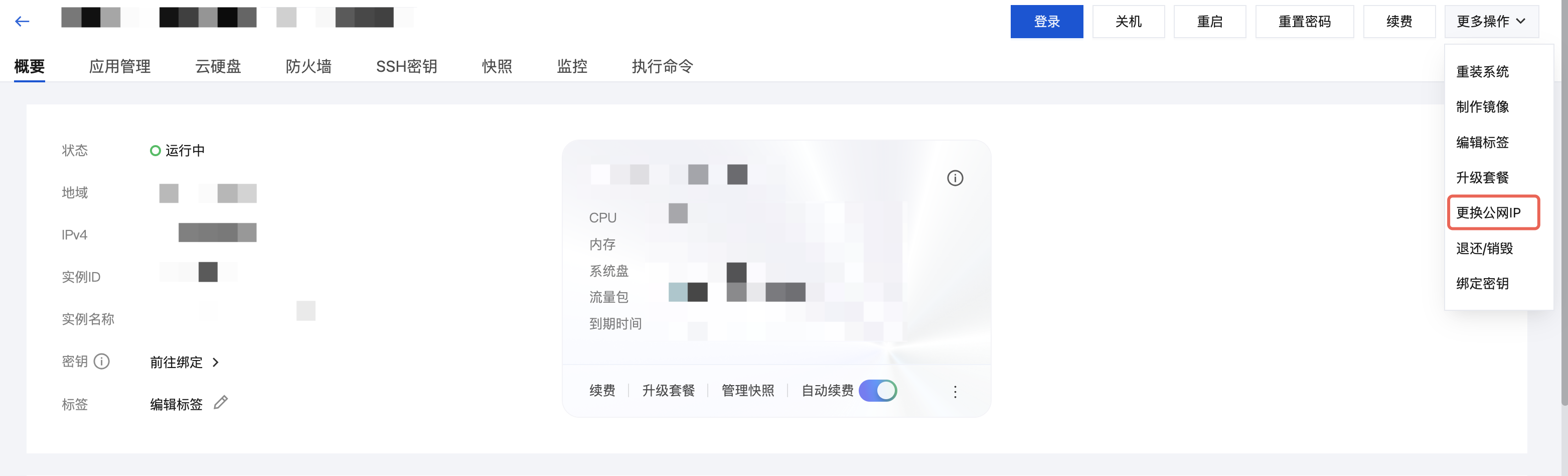 2. 在实例详情页中,选择右上角的更多操作 > 更换公网 IP。如下图所示:
