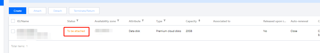 如下图所示,您可在 云硬盘 页面查看已创建的云硬盘,新建的云硬盘为“待挂载”状态。