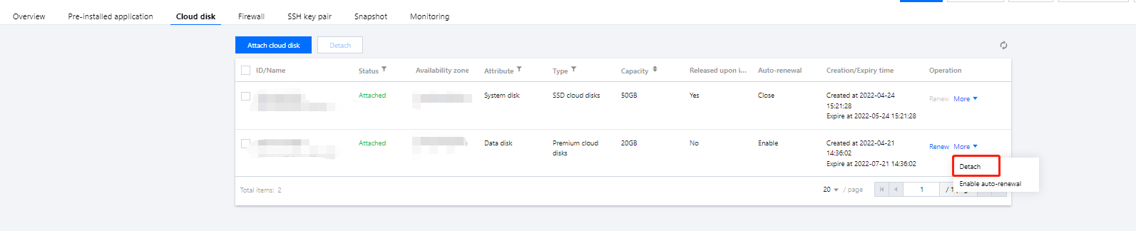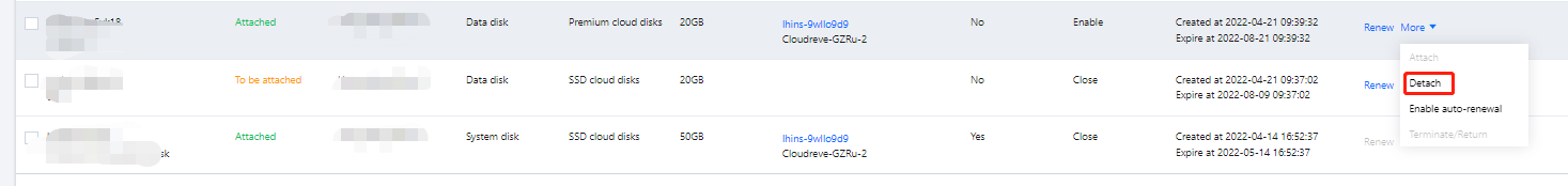2. 选择云硬盘页签,选择需卸载云硬盘所在行右侧的更多 > 卸载。如下图所示: