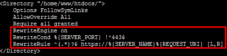 #LoadModule rewrite_module modules/mod_rewrite.so 行首的 #。RewriteEngine onRewriteCond %{SERVER_PORT} !^443$RewriteRule ^(.*)?$ https://%{SERVER_NAME}%{REQUEST_URI} [L,R]