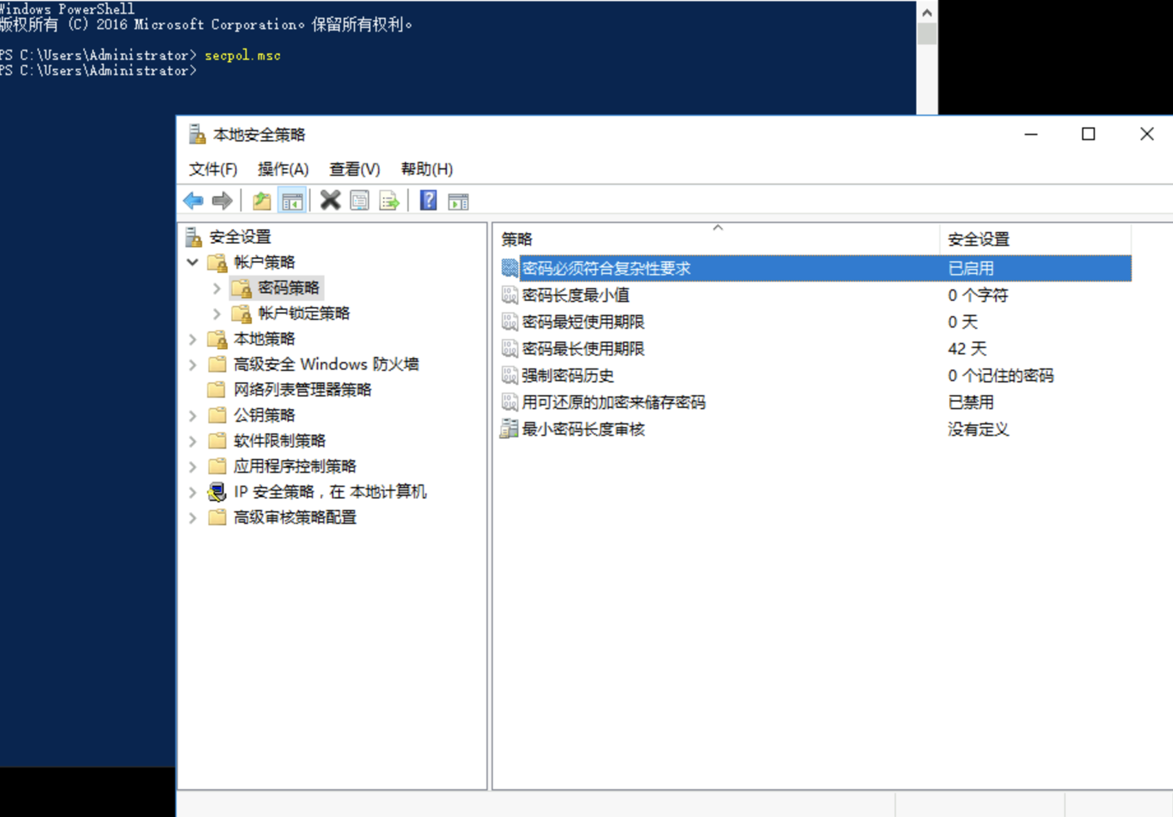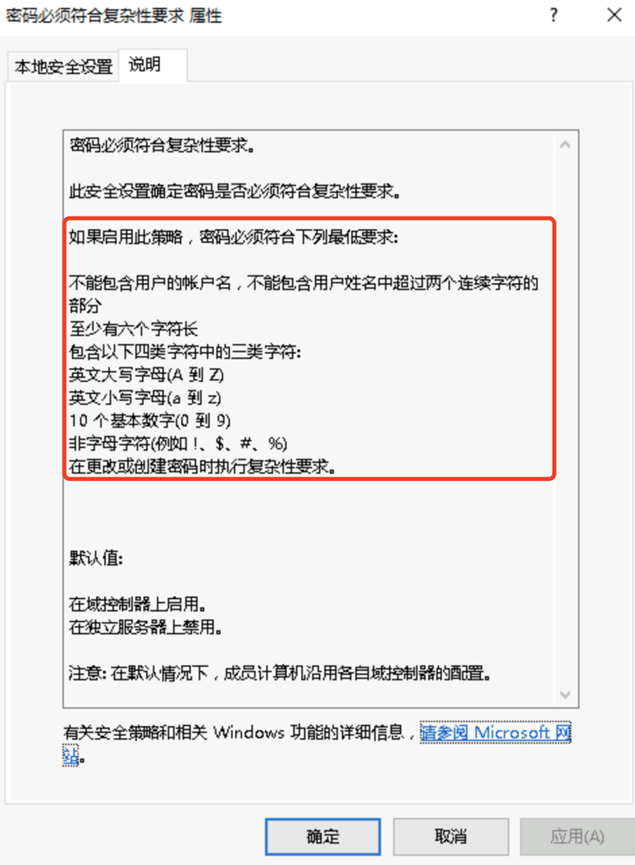 secpol.msc 并回车打开本地安全策略,依次展开:账户策略-->密码策略,可以看到默认开启了 密码必须符合复杂性要求。