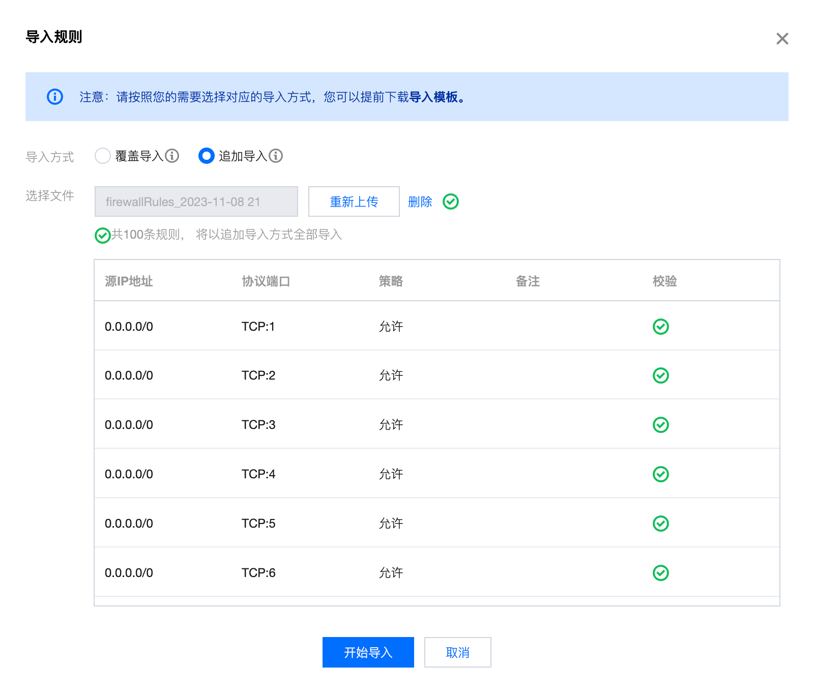 2. 上传规则文件,通过校验后,单击开始导入。