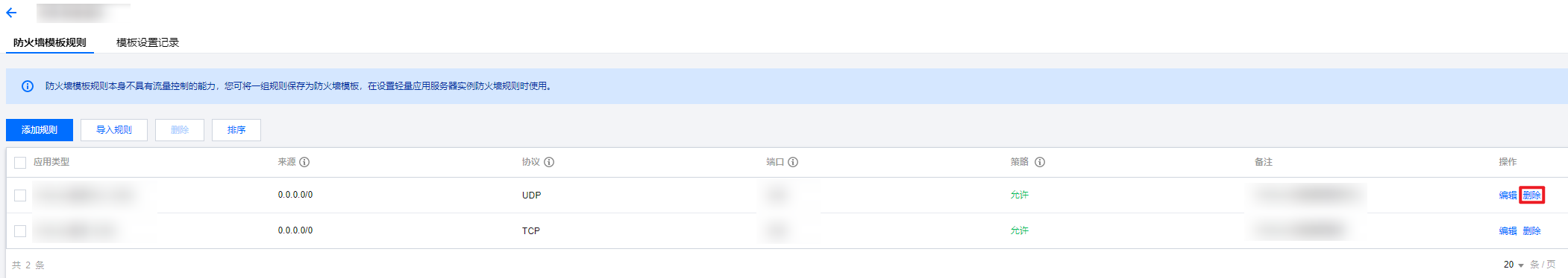 3. 在模板规则列表的操作列单击删除,并在删除弹窗中再次确认是否需要删除。