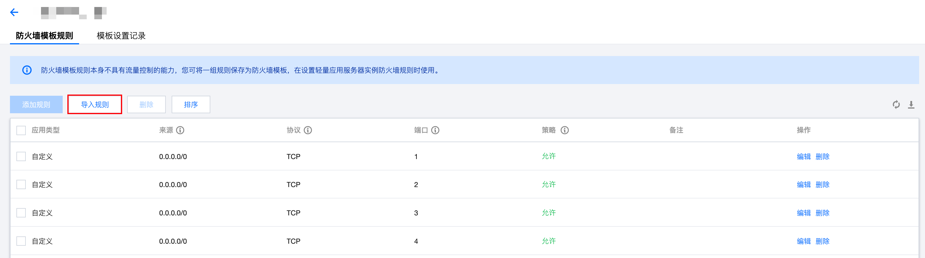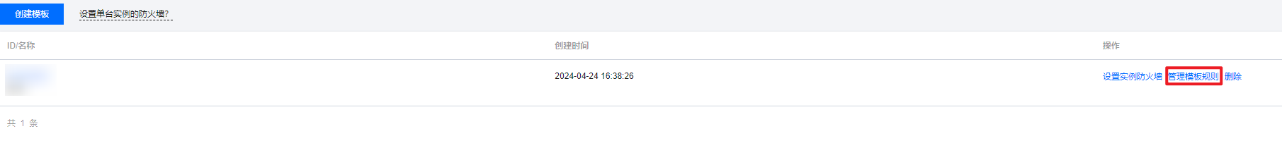 1. 登录轻量应用服务器控制台,选择左侧导航栏中的 防火墙模板。 2. 单击模板操作列中的管理模板规则,进入模板规则列表。