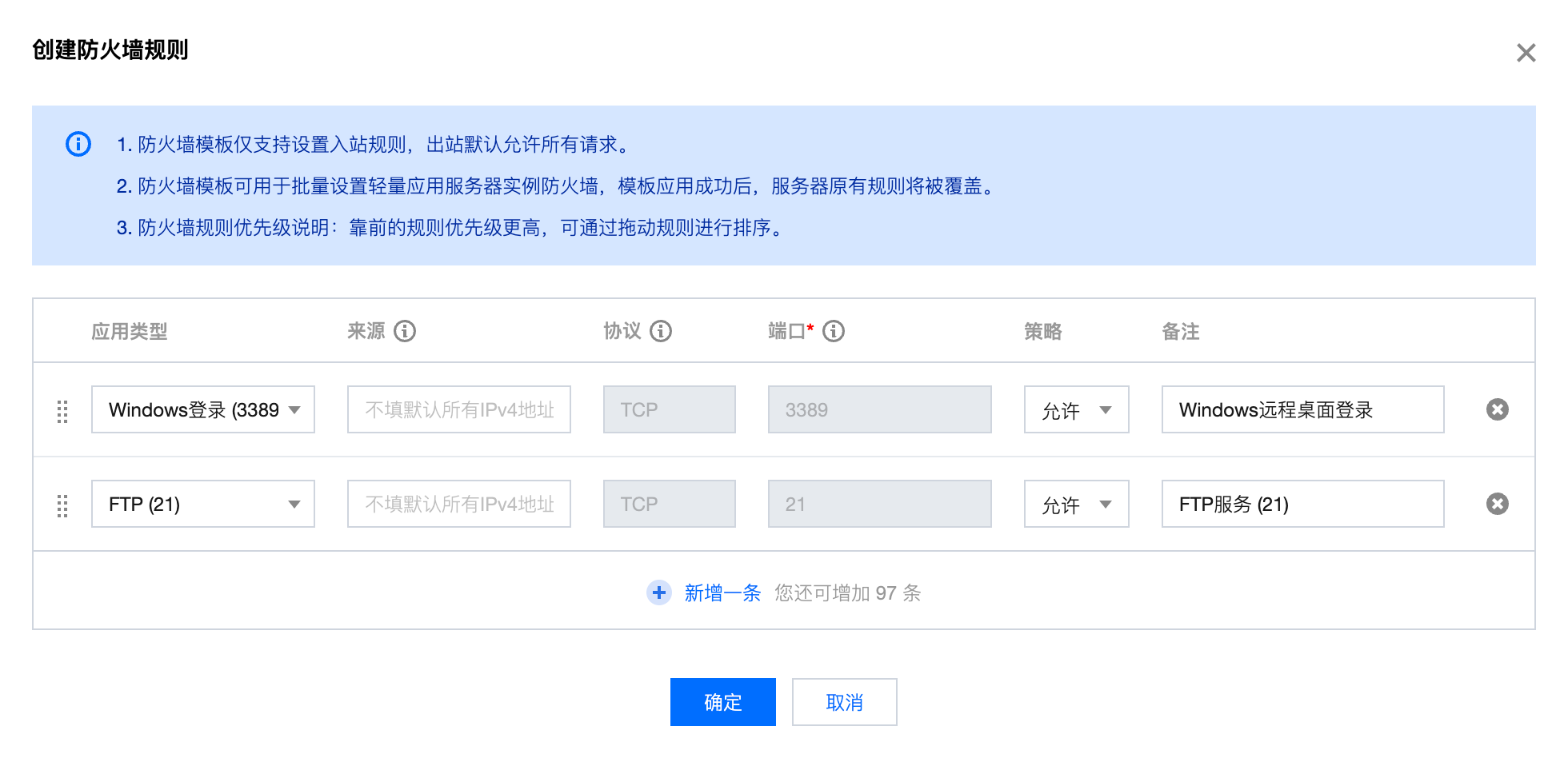 您可以为防火墙模板增加、修改或删除规则,并最终将这些规则通过防火墙模板设置到轻量应用服务器实例中。