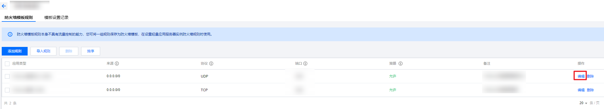 3. 在模板规则列表的操作列单击编辑,在编辑规则弹窗中调整防火墙规则。