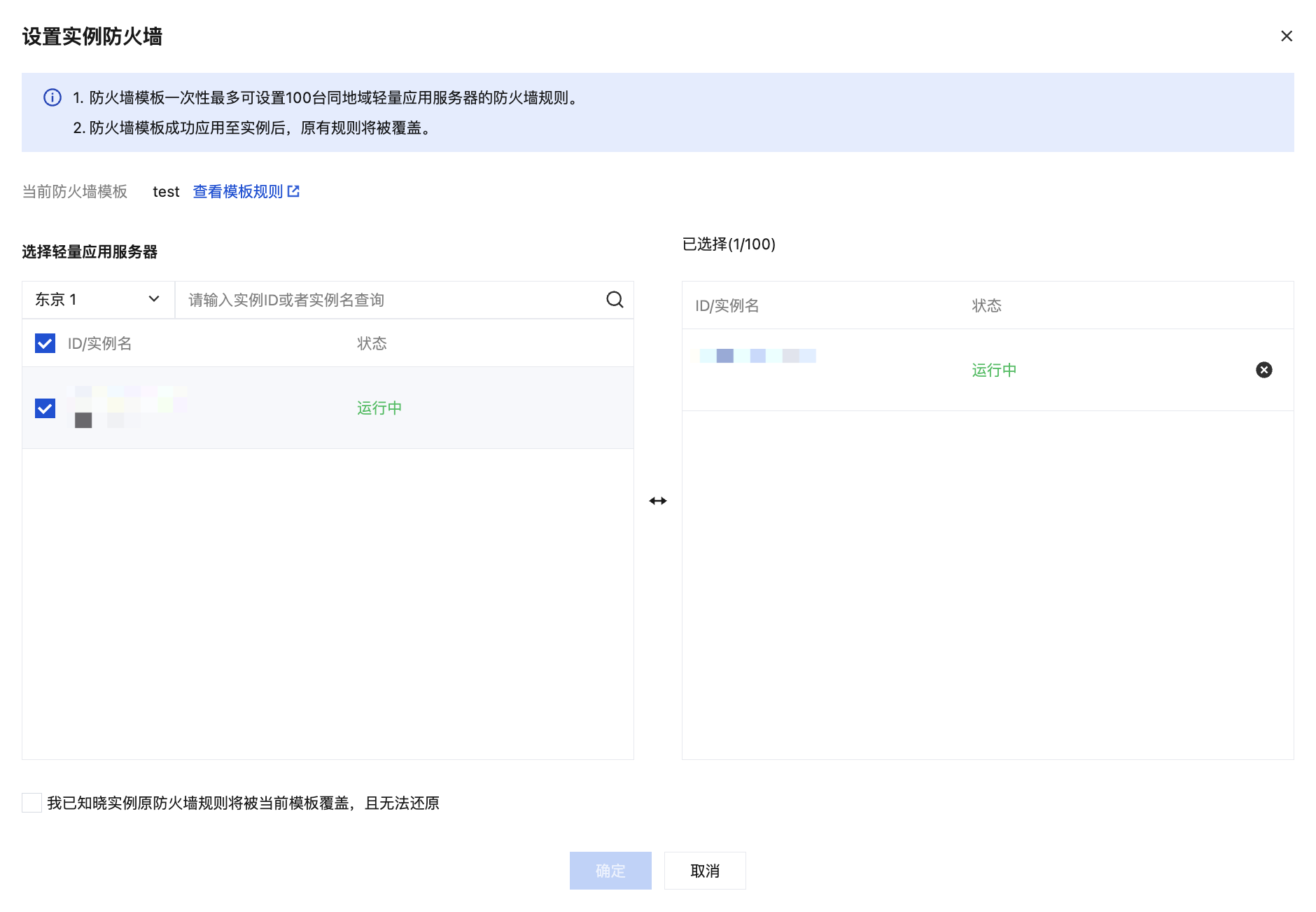 通过防火墙模板成功设置实例防火墙规则后,实例原有的规则将会被覆盖。