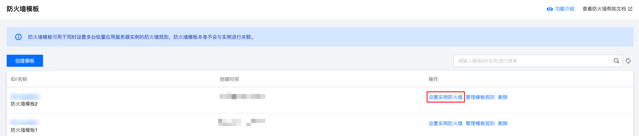 1. 登录轻量应用服务器控制台,选择左侧导航栏中的 防火墙模板。 2. 在防火墙模板列表中选中一个模板,单击操作列的设置实例防火墙。