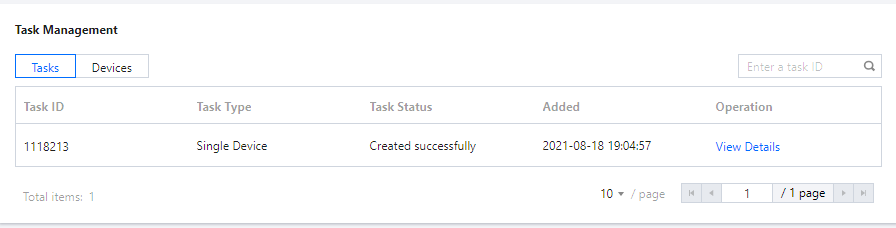 3. 在任务管理的任务明细或设备明细,单击某次任务右侧的查看详情,进入任务详情页,可以查看此次任务下发的设备清单、下发状态以及不同下发状态的设备数量统计。