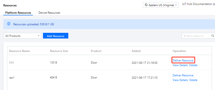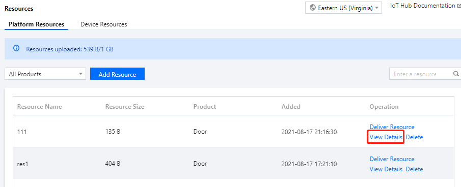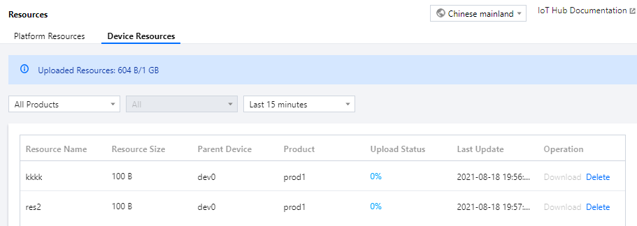 1. 设备根据 资源上传 通信协议,进行资源上传到平台,上传完成后,资源将显示在物联网通信控制台资源列表中。 2. 登录 物联网通信控制台,单击左侧导航资源管理,选择设备资源进入资源列表页,可查看设备上传的全部资源,并且可对资源进行下载和删除等操作。