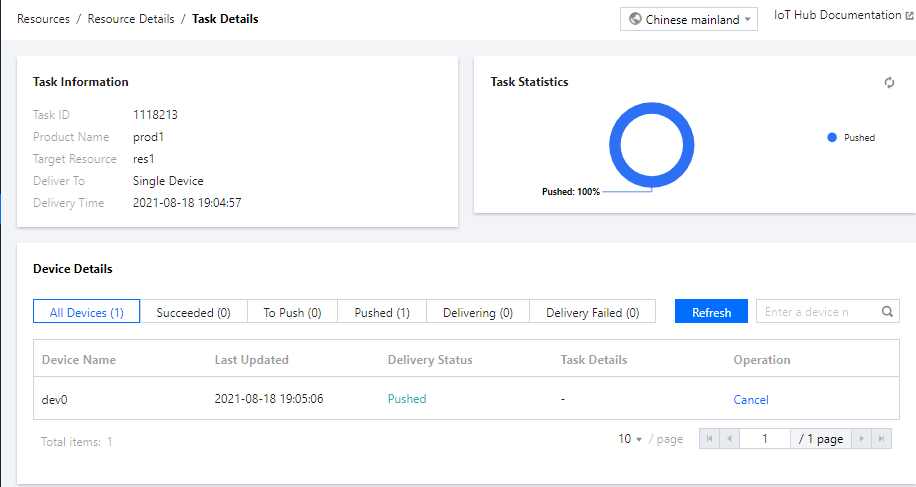 另外,在设备详情列表右侧,可以根据下发进度进行资源下发的取消、重试操作。取消下发的设备下发状态将标记为下发失败;下发失败的设备可单击重试进行重新下发。
