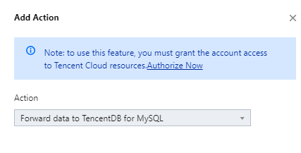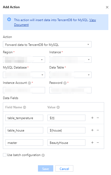4. 在弹出的“添加规则”窗口,选择“数据转发到云数据库(MySQL)选项”,授权成功后,需要配置 MySQL 实例信息和写入的字段信息,如下图所示。配置完成后单击保存即可。