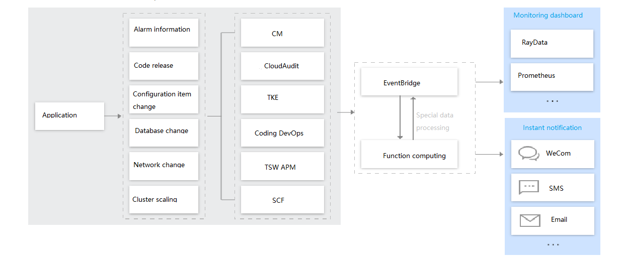 事件总线 EventBridge 可以作为中心,接收所有应用的状态变化,通过访问 API 产生的审计事件或者监控告警事件可以快速发送到 EB,然后将这些应用状态变化分别路由到需要感知这些变化的服务,完成消息的推送与自动化处理。