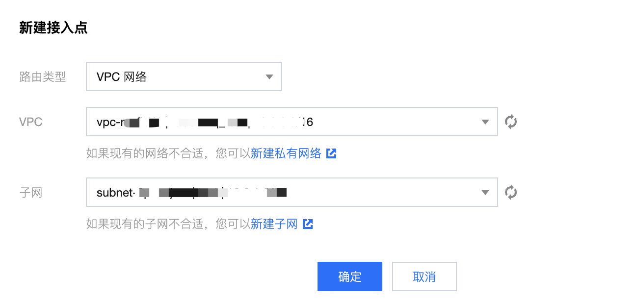 3. 选择接入点页签,单击新建,路由类型选择 VPC 网络,在新建 VPC 接入点对话框中,选择 VPC、子网,填写备注。