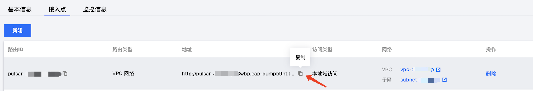 4. 单击提交,即可完成 VPC 网络的接入。在接入点列表您可以复制接入点地址。