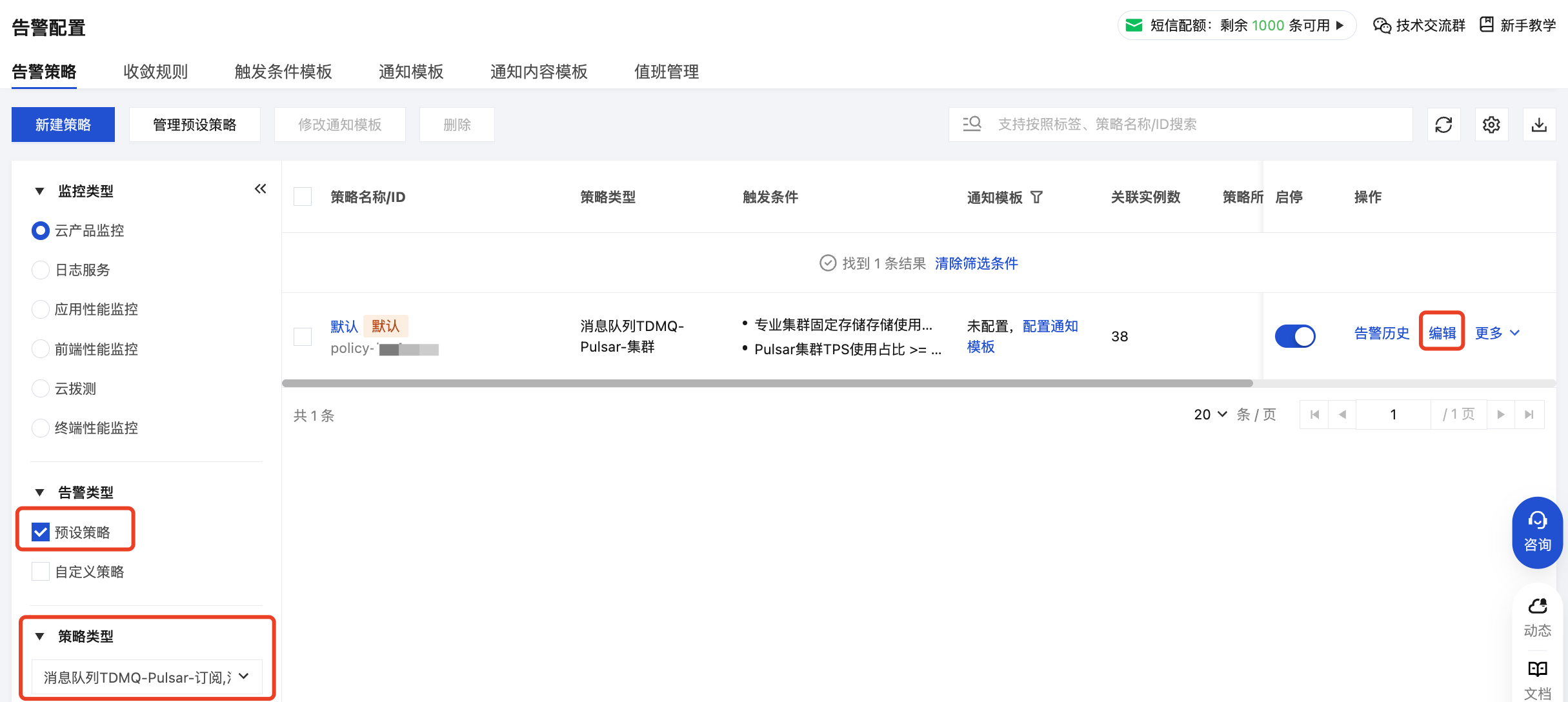 TDMQ Pulsar 版预设了多维度的默认告警策略,您可在腾讯云可观测平台上查看并修改这些默认策略,也可以针对业务情况设置自定义策略,快速开启集群告警监测。