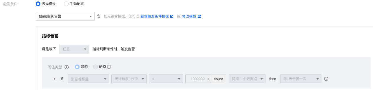 2. 设置告警触发条件,支持选择模板和手动配置,默认选择手动配置。