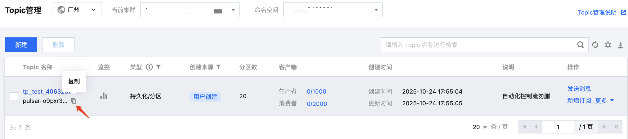 在控制台的 Topic 管理列表页面复制 Topic 名称,格式为clusterid/namespace/topic。