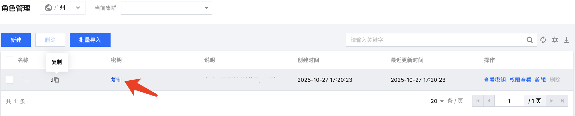 在角色管理列表页面复制密钥。密钥泄露很可能导致您的数据泄露,请妥善保管您的密钥。