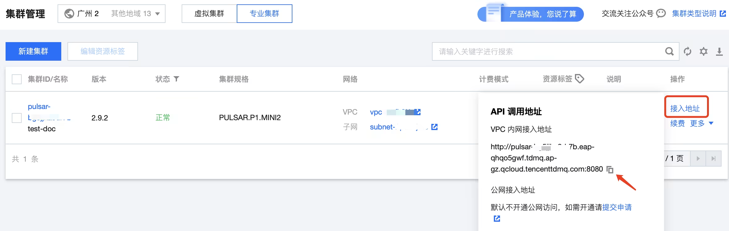 在集群管理页面操作栏的接入地址获取,根据网络类型的不同选择不同的接入点。
