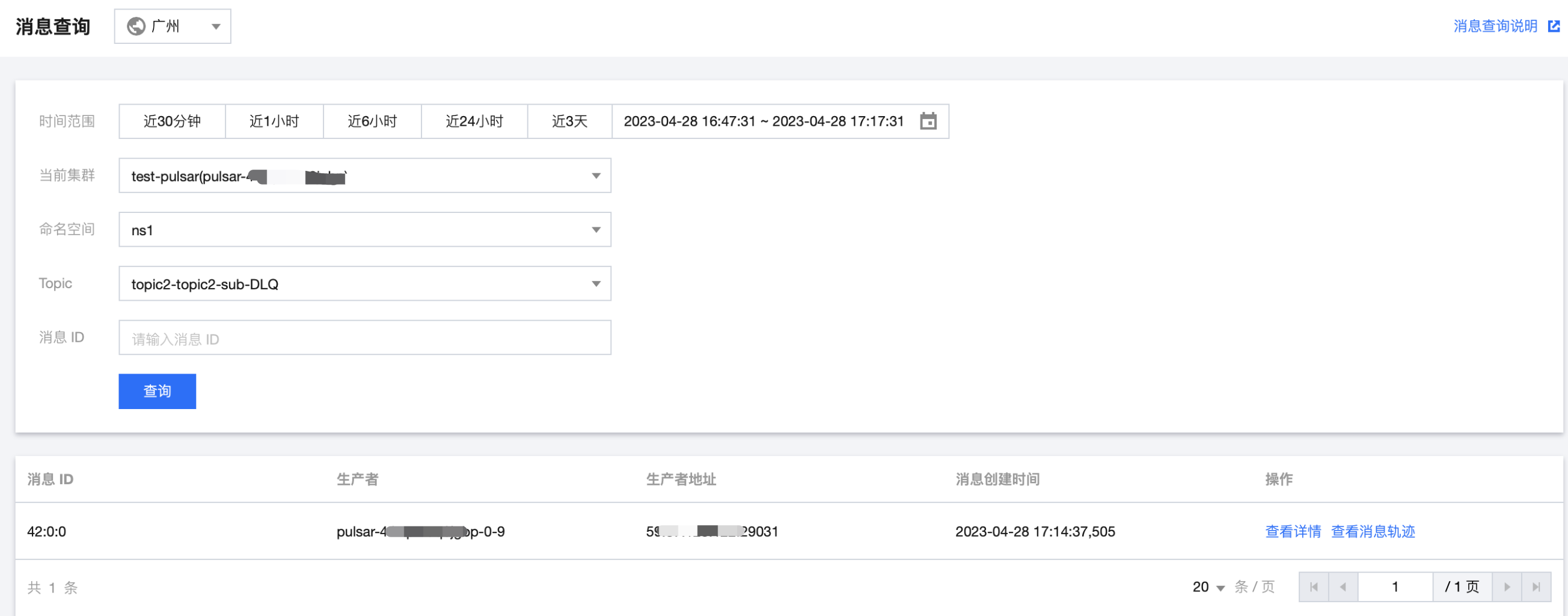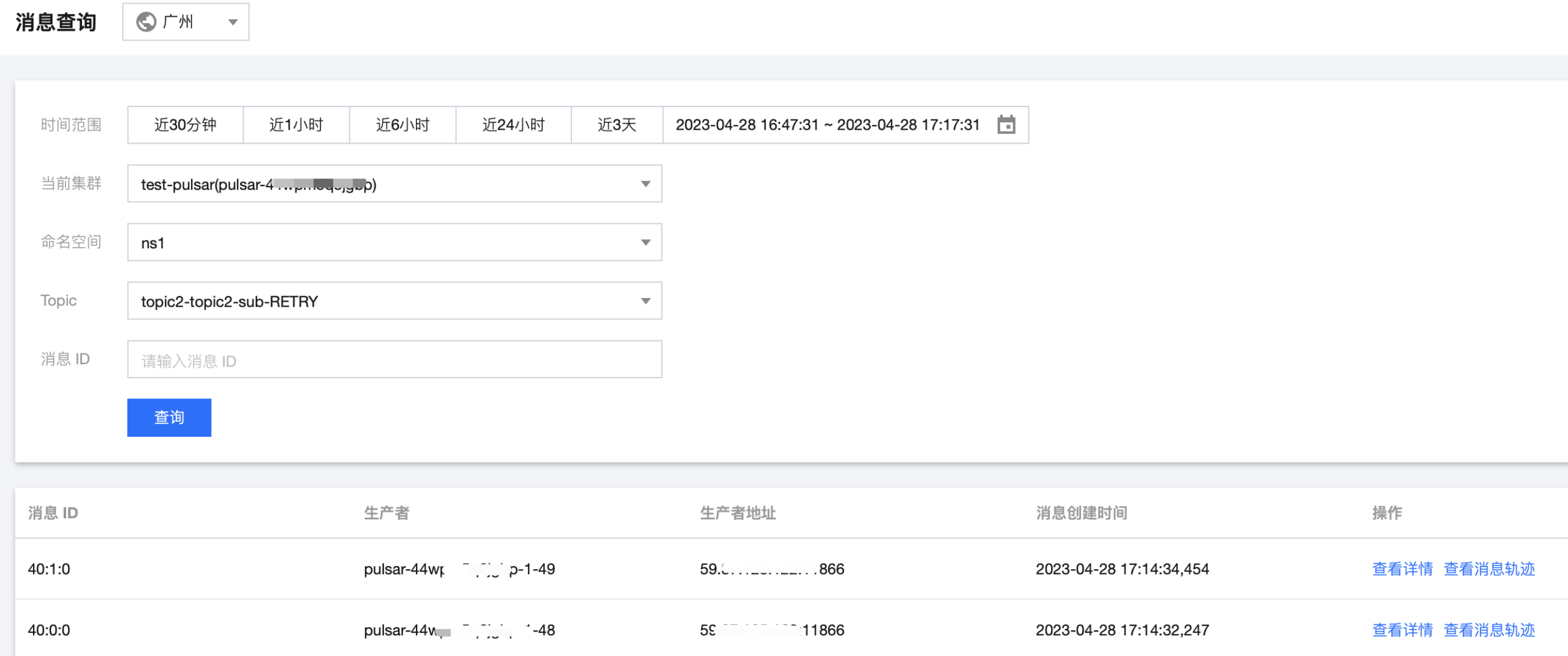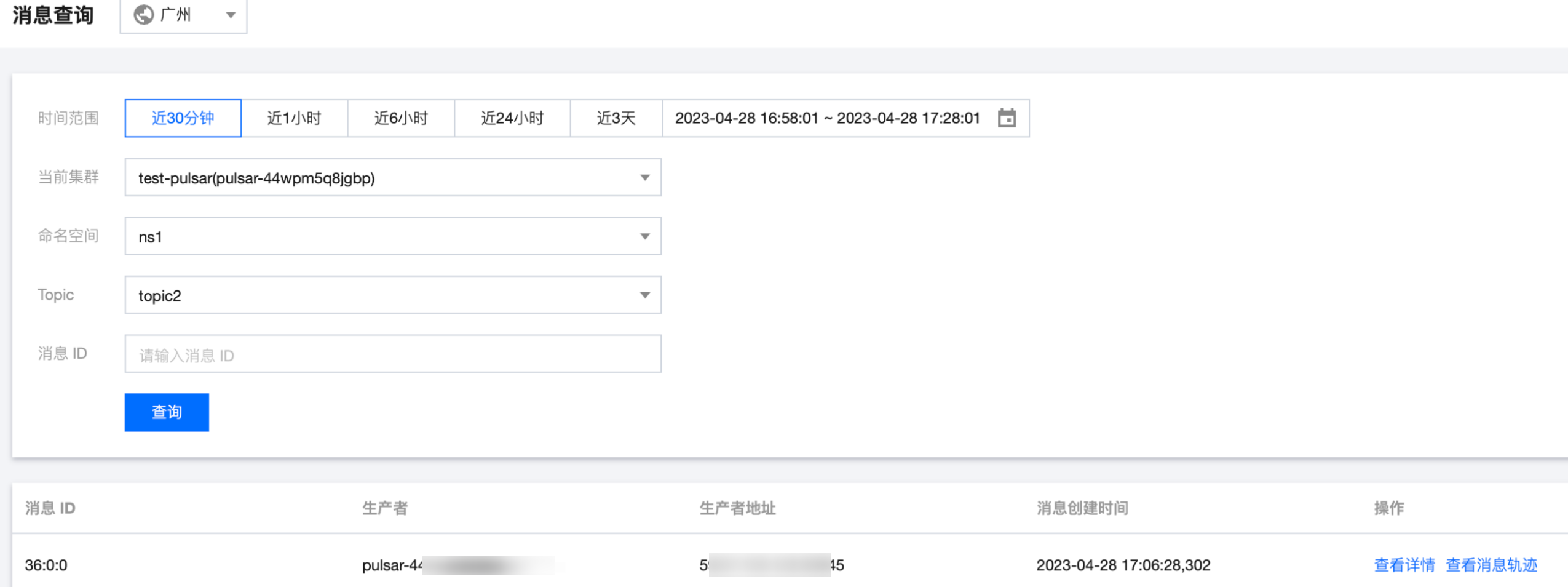 3. 登录 TDMQ Pulsar 版控制台,在消息查询页面,可以看到向 topic 中生产的消息。