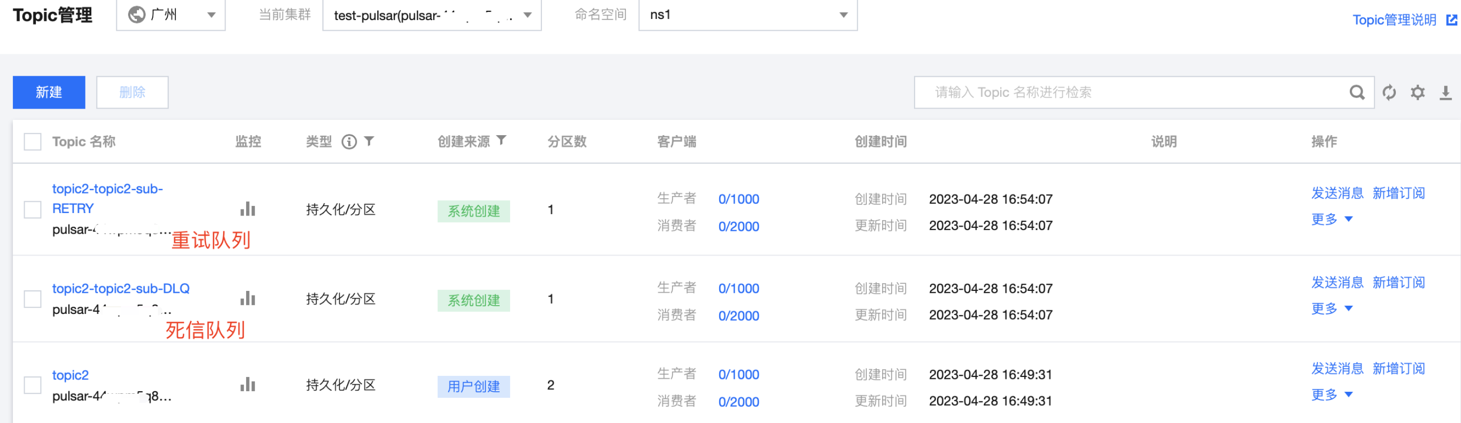 3. 登录 TDMQ Pulsar 版控制台,在消息查询页面可以看到,重试 topic 中展示了2条消息,死信 topic 中展示了1条消息,代表消息经过2次重试投递后,被投递到死信队列。