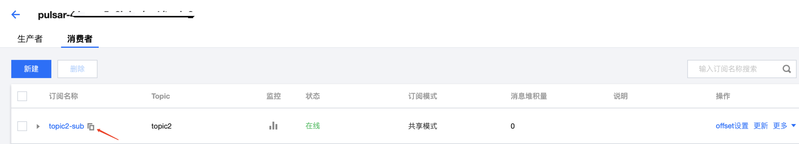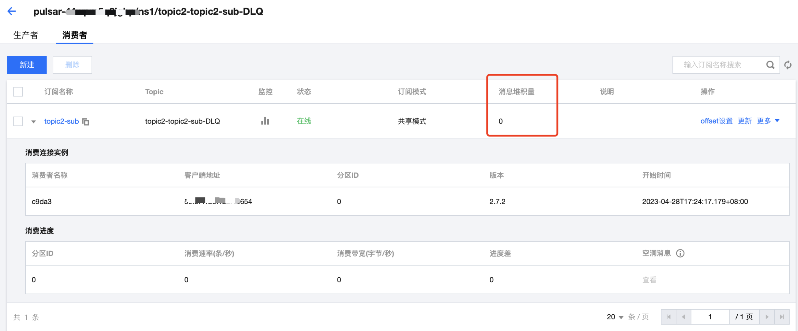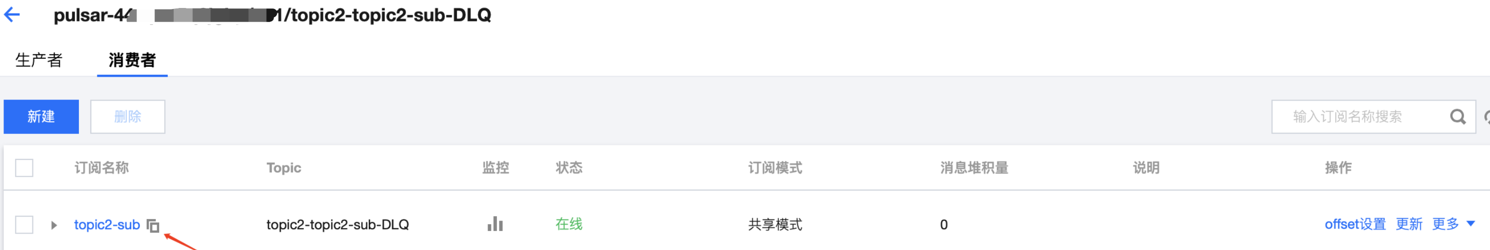 6. 单击操作列的更多 > 查看订阅/消费者,可看到刚创建好的订阅。