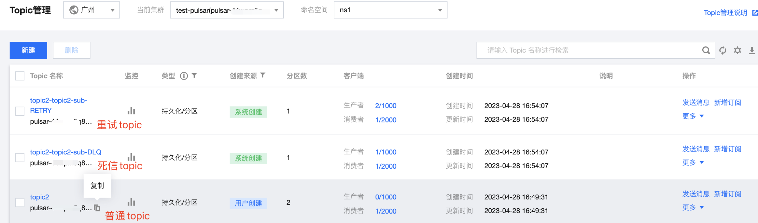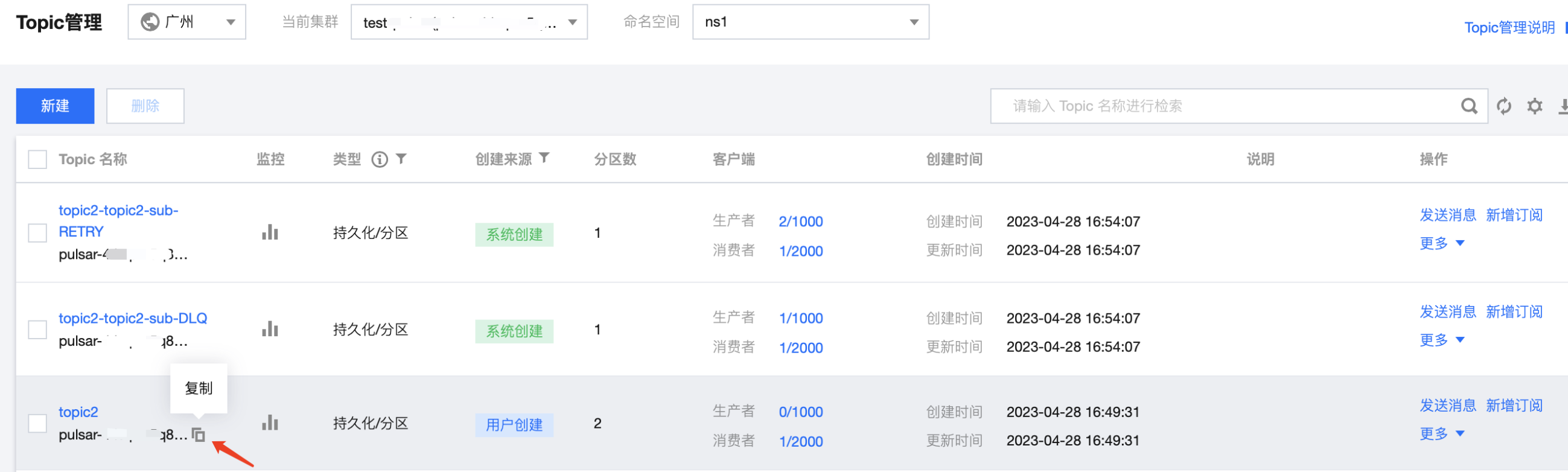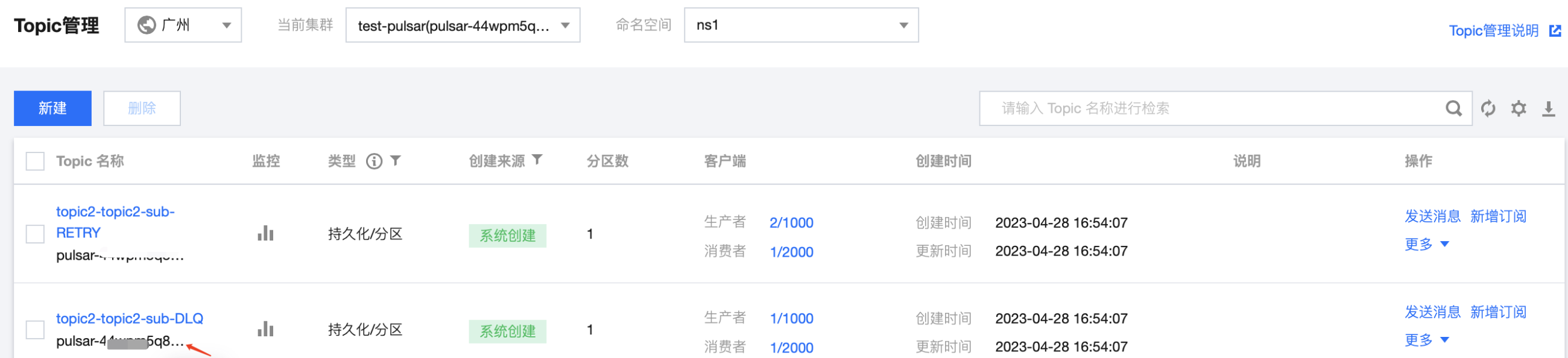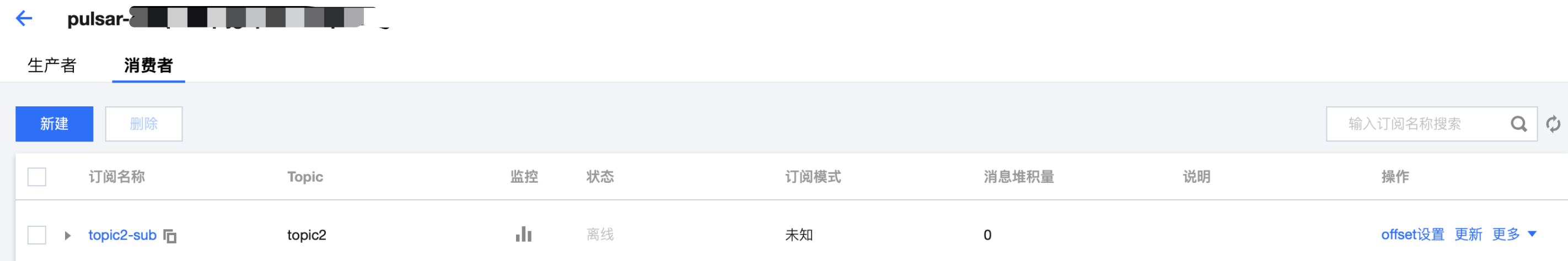 6. 单击操作列的更多 > 查看订阅/消费者,可看到刚创建好的订阅。