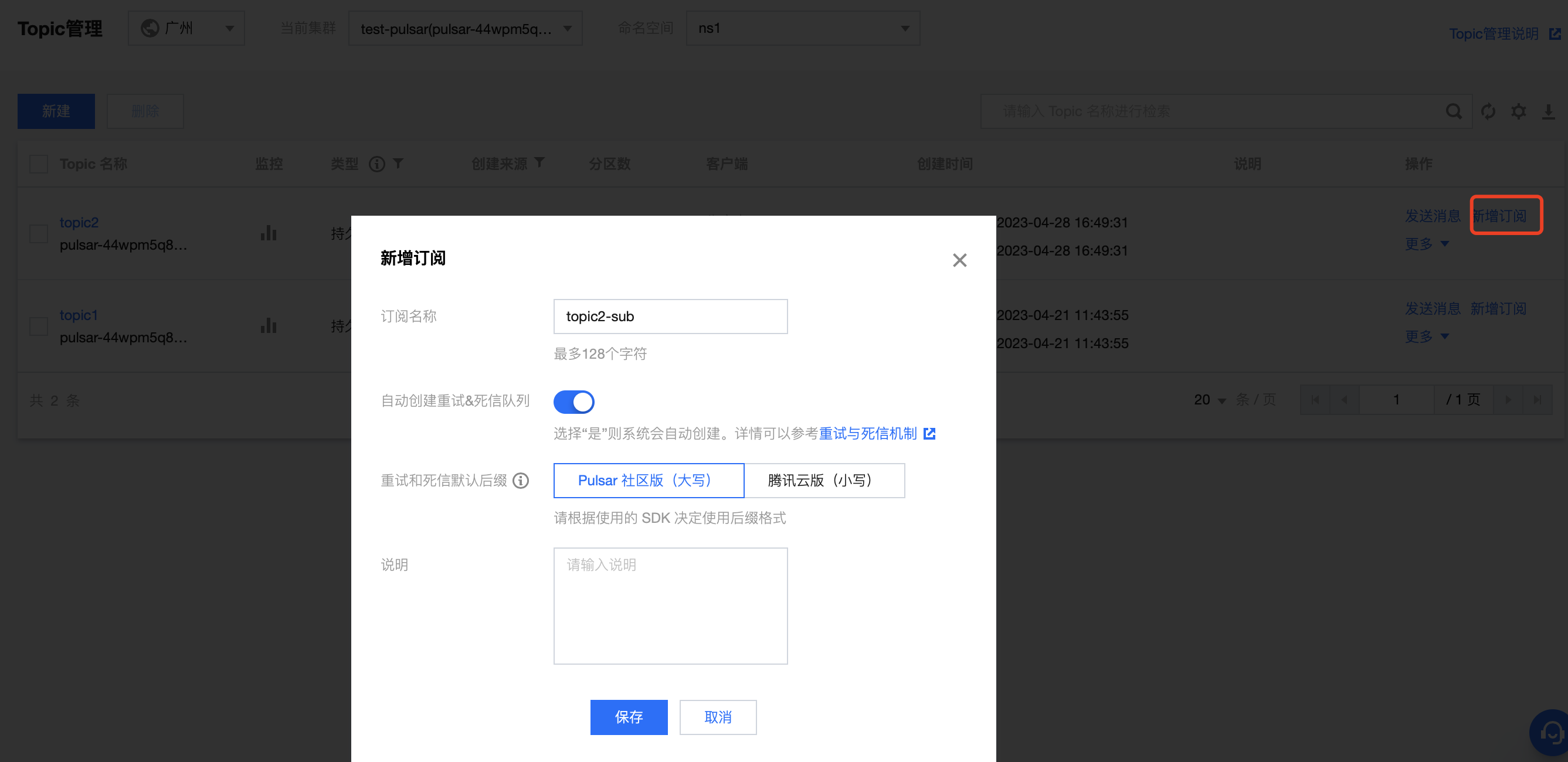 4. 单击新建好的 Topic 操作列的新增订阅,输入订阅名称,开启自动创建重试&死信队列,重试和死信默认后缀选择 Pulsar 社区版(大写),为刚新建好的 Topic 创建一个订阅关系并开启重试&死信队列。