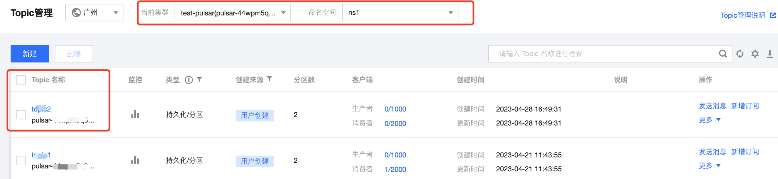 2. 在左侧导航栏选择 Topic 管理页签,当前集群和命名空间分别勾选入门课程中创建好的集群和命名空间。