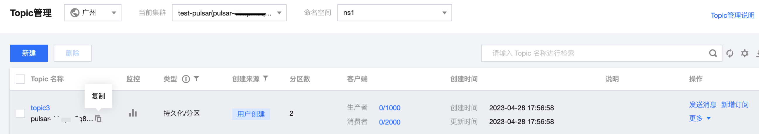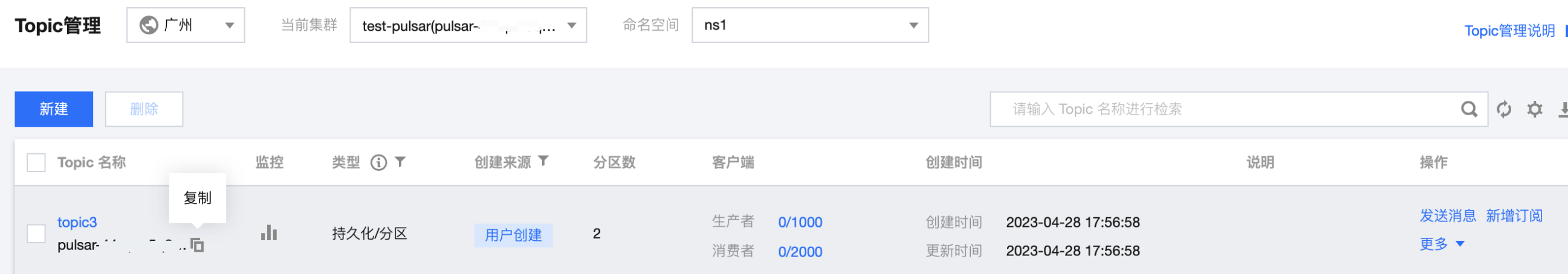 topic:填写创建好的 topic 名称,需要填入完整路径,即 persistent://clusterid/namespace/Topic,clusterid/namespace/topic的部分可以从控制台上 Topic 管理页面直接复制。