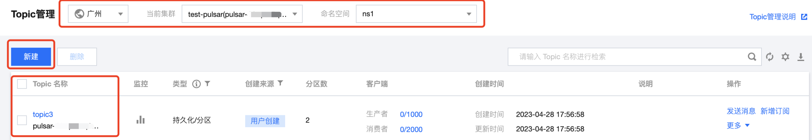 2. 在左侧导航栏选择 Topic 管理页签,当前集群和命名空间分别勾选创建好的集群和命名空间。