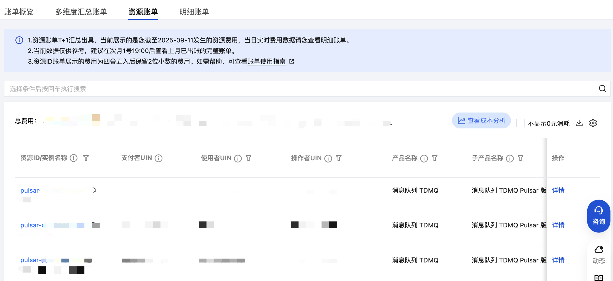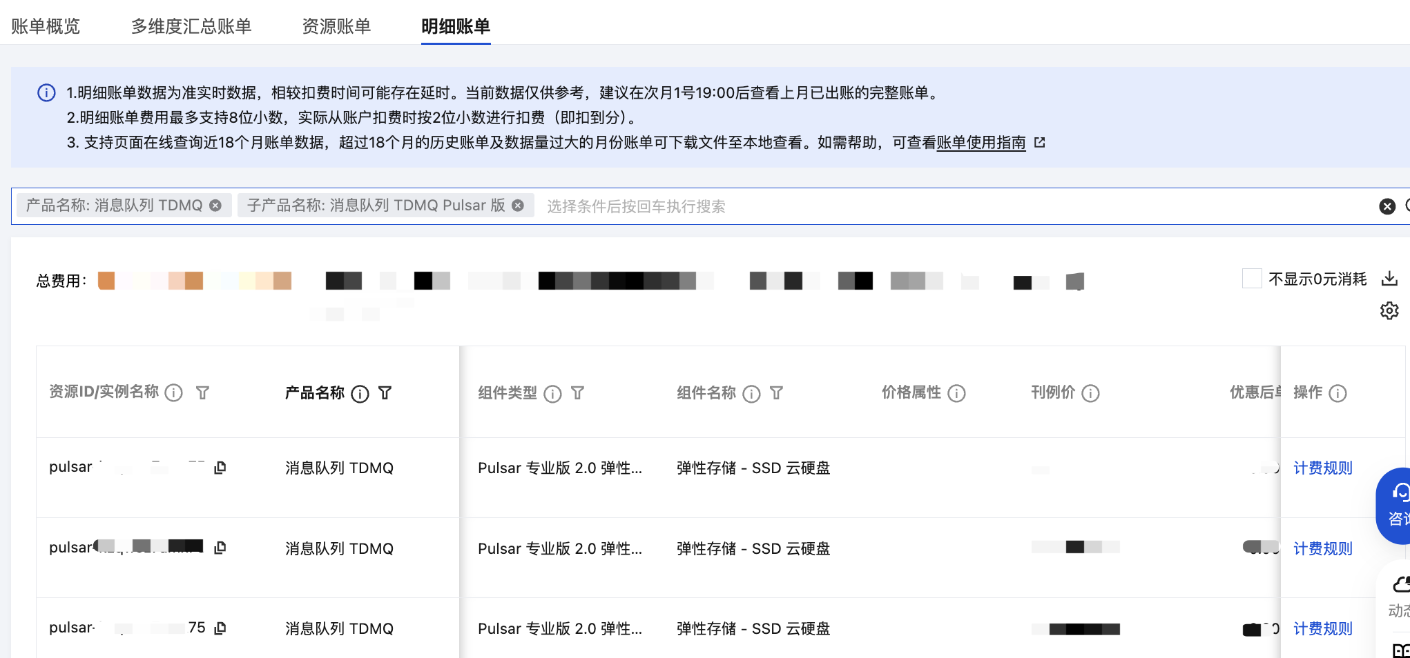 资源账单:在账单查看页面选择资源账单页签,以消息队列 Pulsar 版为例,产品选择消息队列 TDMQ,子产品选择消息队列TDMQ Pulsar 版,可以查看消息队列 Pulsar 版的各资源的消费明细。