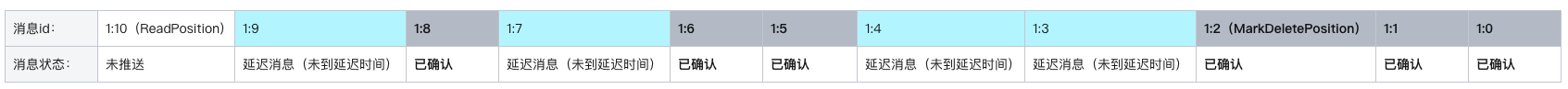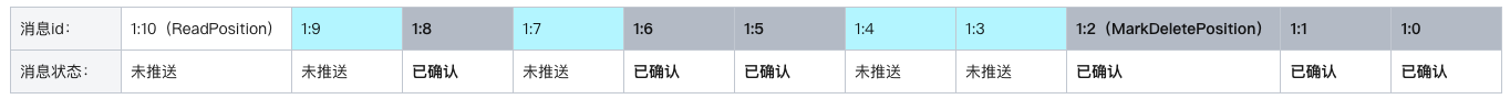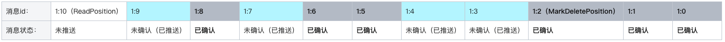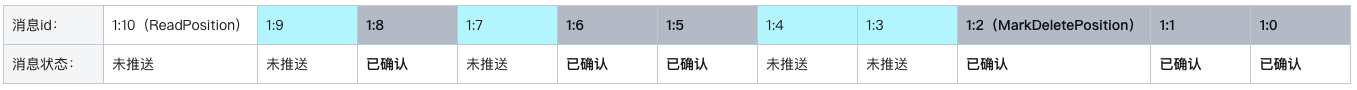 MarkDeletePosition:消费进度初始位置,此位置以及之前的消息,被认为已经全部消费过。等同于 Kafka 中的 offset。