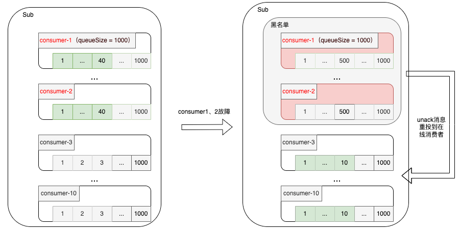 1. 当服务端有推送消息到消费者,但是超过一定时间没有接受到 ACK 请求,会将对应的消费者添加到黑名单,并将该消费者 hold 的所有 unack 消息重新推送到其他在线消费者实例。