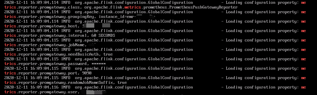 metrics.reporter.promgateway.class: org.apache.flink.metrics.prometheus.PrometheusPushGatewayReportermetrics.reporter.promgateway.jobName: climatePredictmetrics.reporter.promgateway.randomJobNameSuffix:truemetrics.reporter.promgateway.interval: 60 SECONDSmetrics.reporter.promgateway.groupingKey:instance_id=emr-xxxxmetrics.reporter.promgateway.host: 172.xx.xx.xxmetrics.reporter.promgateway.port: 9090metrics.reporter.promgateway.needBasicAuth: truemetrics.reporter.promgateway.user: appidmetrics.reporter.promgateway.password: token