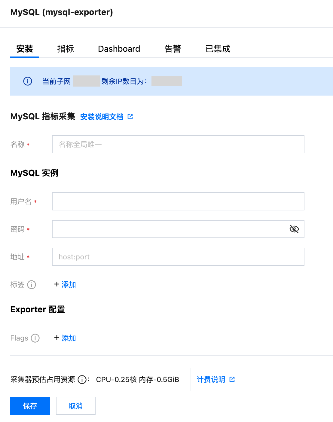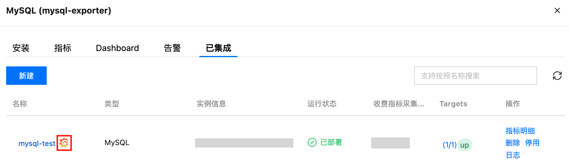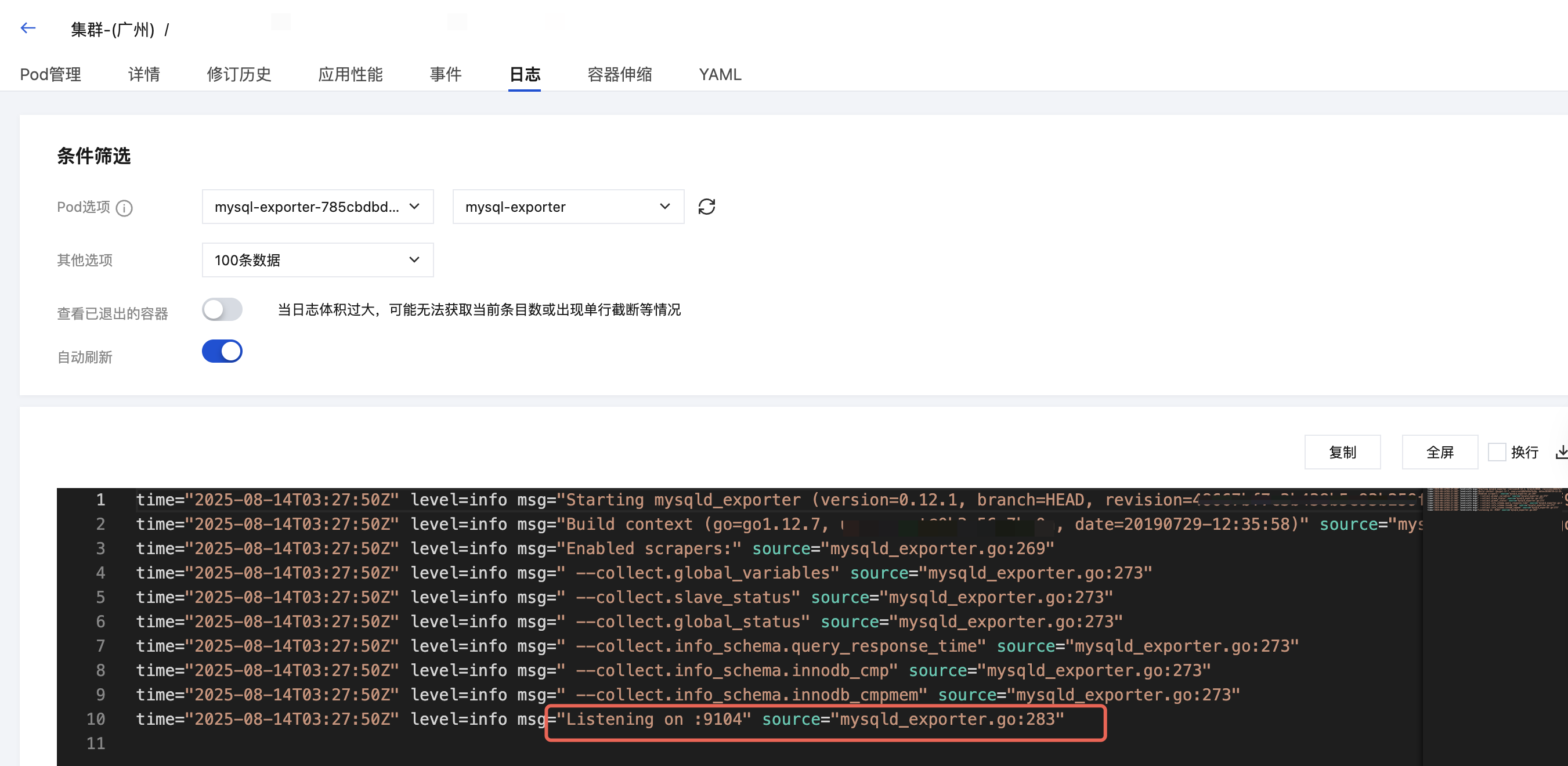 apiVersion: apps/v1kind: Deploymentmetadata:labels:k8s-app: mysql-exporter # 根据业务需要调整成对应的名称,建议加上 MySQL 实例的信息name: mysql-exporter # 根据业务需要调整成对应的名称,建议加上 MySQL 实例的信息namespace: mysql-demospec:replicas: 1selector:matchLabels:k8s-app: mysql-exporter # 根据业务需要调整成对应的名称,建议加上 MySQL 实例的信息template:metadata:labels:k8s-app: mysql-exporter # 根据业务需要调整成对应的名称,建议加上 MySQL 实例的信息spec:containers:- env:- name: DATA_SOURCE_NAMEvalueFrom:secretKeyRef:name: mysql-secret-test # 对应上一步中的 Secret 的名称key: datasource # 对应上一步中的 Secret Keyimage: ccr.ccs.tencentyun.com/rig-agent/mysqld-exporter:v0.12.1imagePullPolicy: IfNotPresentname: mysql-exporterports:- containerPort: 9104name: metric-portterminationMessagePath: /dev/termination-logterminationMessagePolicy: FilednsPolicy: ClusterFirstimagePullSecrets:- name: qcloudregistrykeyrestartPolicy: AlwaysschedulerName: default-schedulersecurityContext: {}terminationGracePeriodSeconds: 30