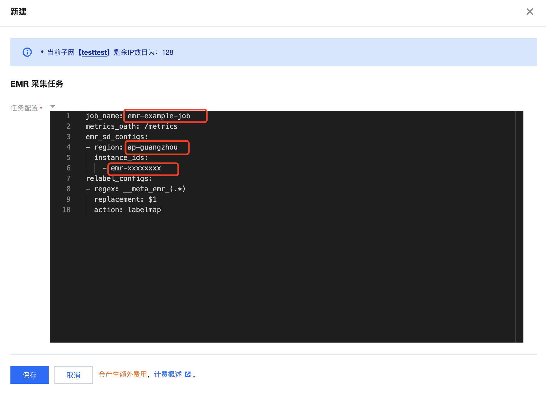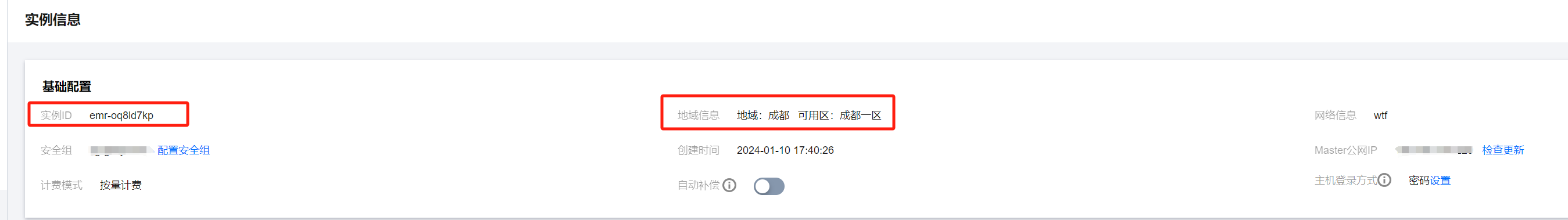 6. 进入 EMR 控制台,点击集群的 ID/名称 > 实例信息,获取 EMR 集群所在地域、EMR 实例 ID。 7. 在 EMR 填写任务配置(Yaml 格式)。按下图红框依次填写任务名、EMR 集群所在地域、EMR 实例 ID。