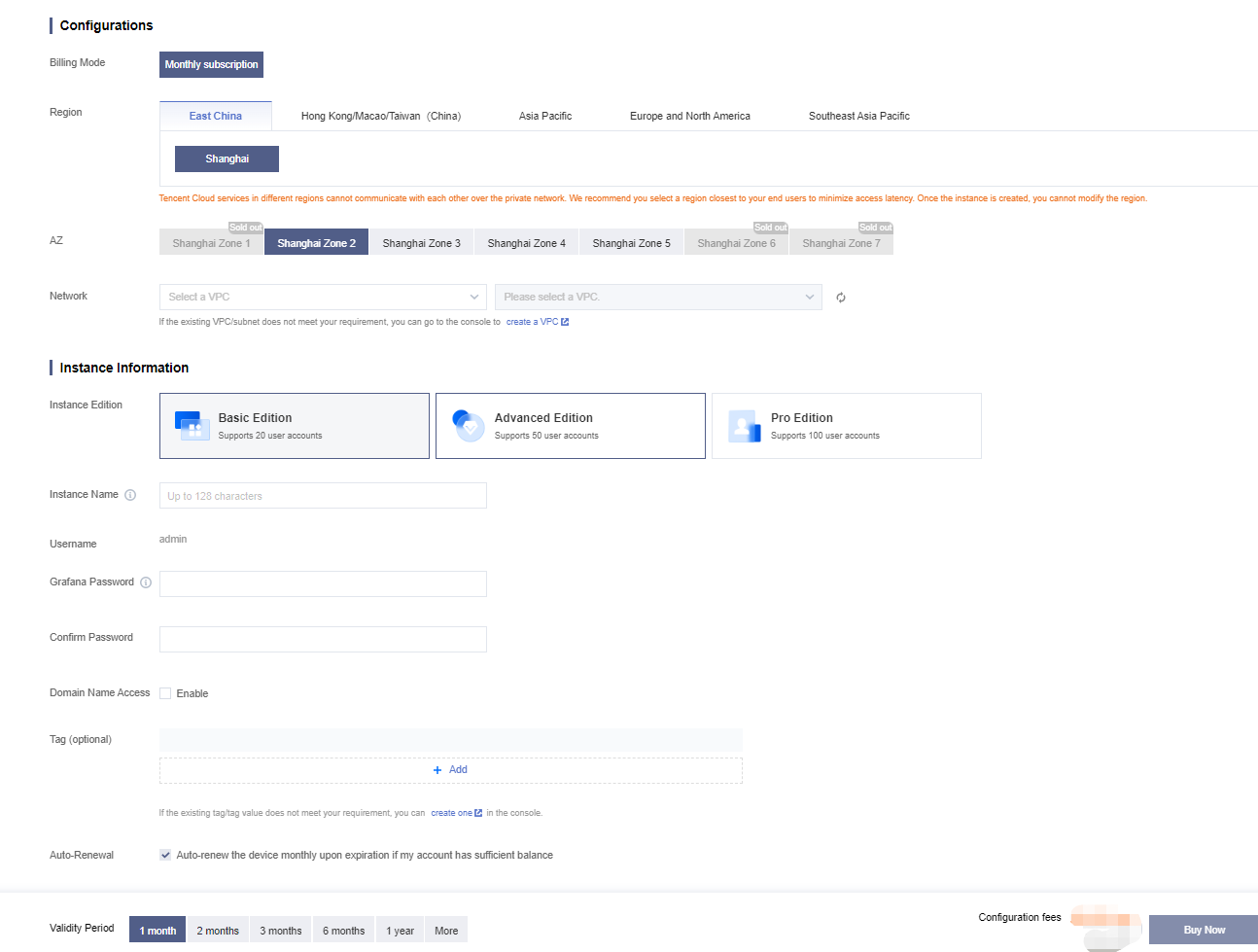 计费模式 | 必选 | 目前仅支持包年包月模式。 |