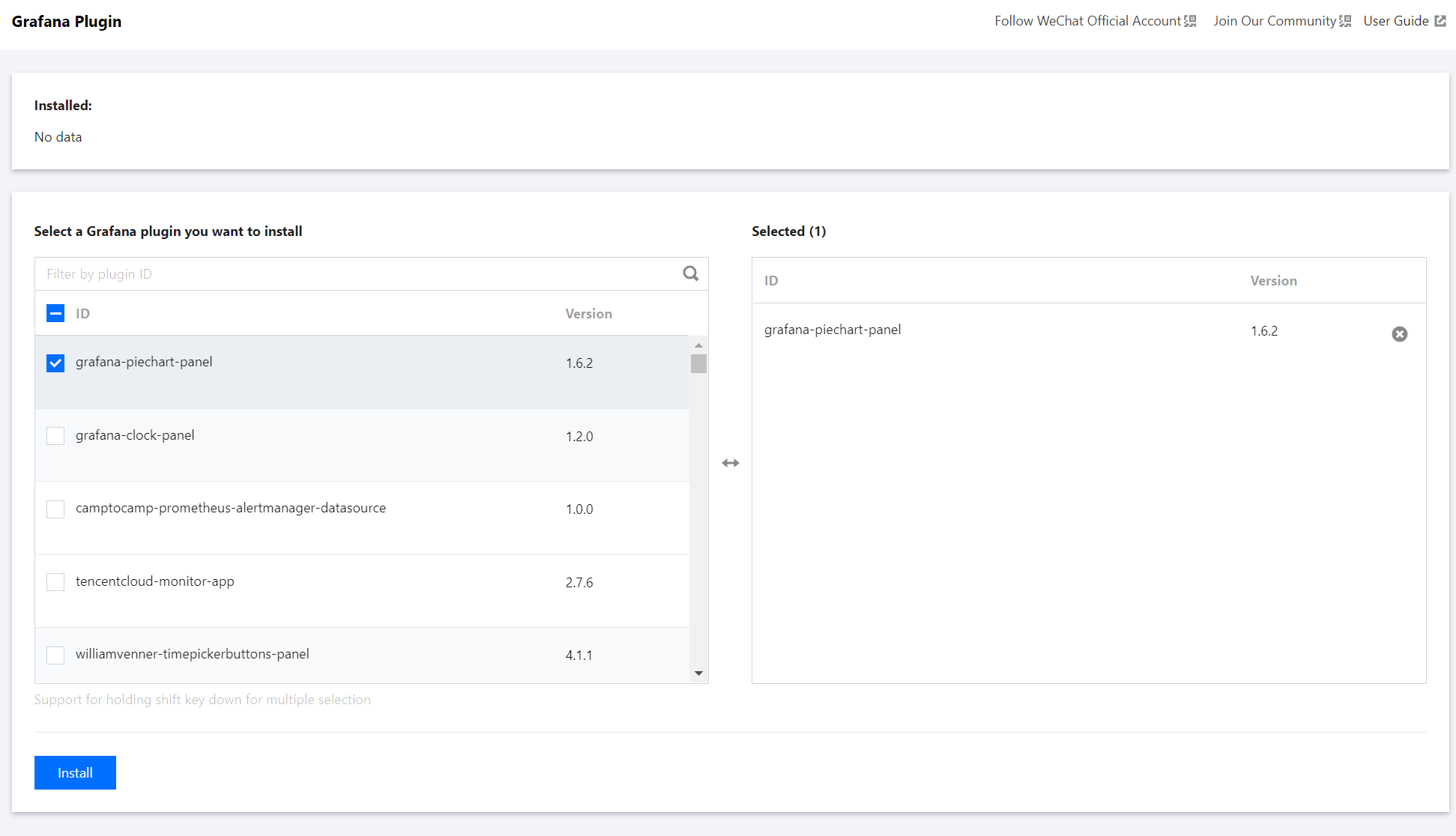 目前已提供 Grafana 常见插件供您按需安装,您可以参考本文安装 Grafana 可视化服务常用插件。