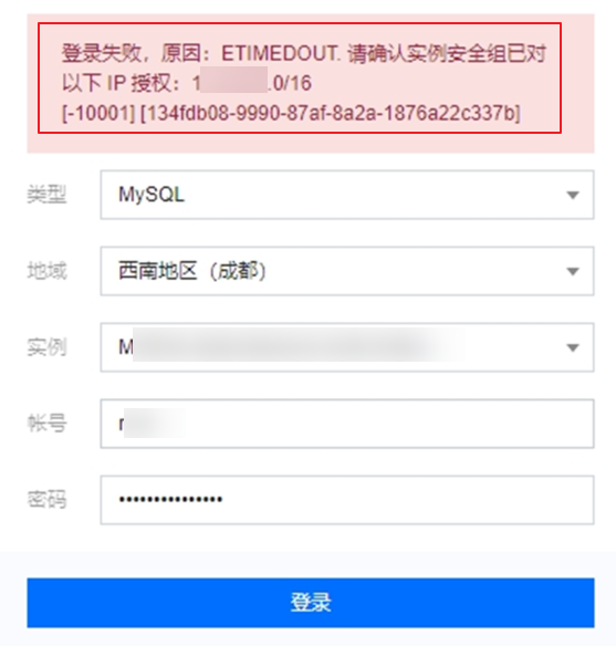 请登录 MySQL 控制台,在实例列表,单击实例 ID 或操作列的管理,在实例管理页面,选择数据库管理 > 安全组页签,在已加入安全组列表中,单击安全 组 ID,在入站规则页签,单击添加规则,输入提示信息中的 IP 地址。 数据库账号授权 IP 地址