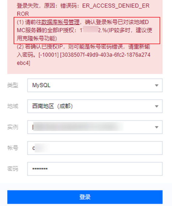 原因二:没有对 DMC 的服务端地址进行访问授权,报错界面会提示安全组、数据库账号需要授权的 IP 地址