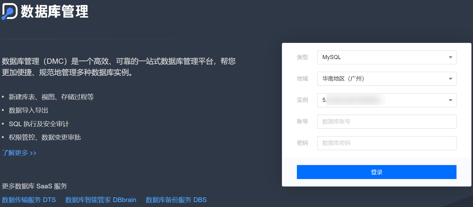 2. 选择数据库类型、地域、实例 ID、实例账号和密码,单击登录